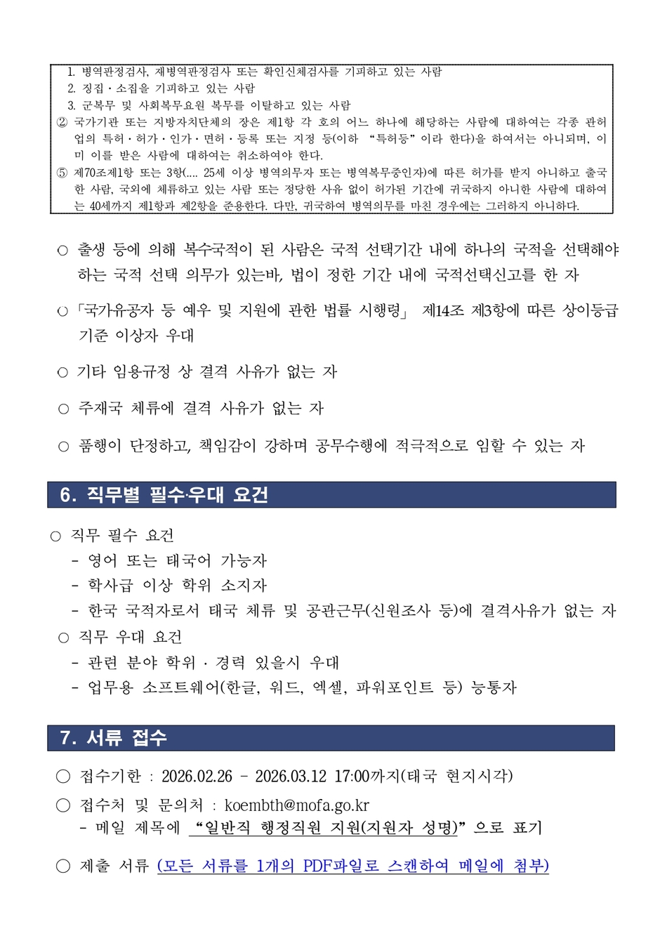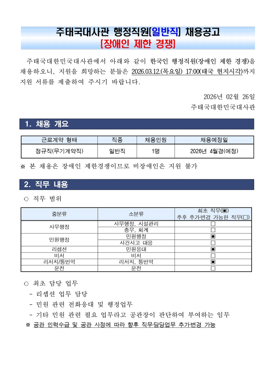 [재공고] 주태국대사관 일반직 행정직원(장애인 제한 경쟁) 채용공고 (~3월12일 17:00까지)