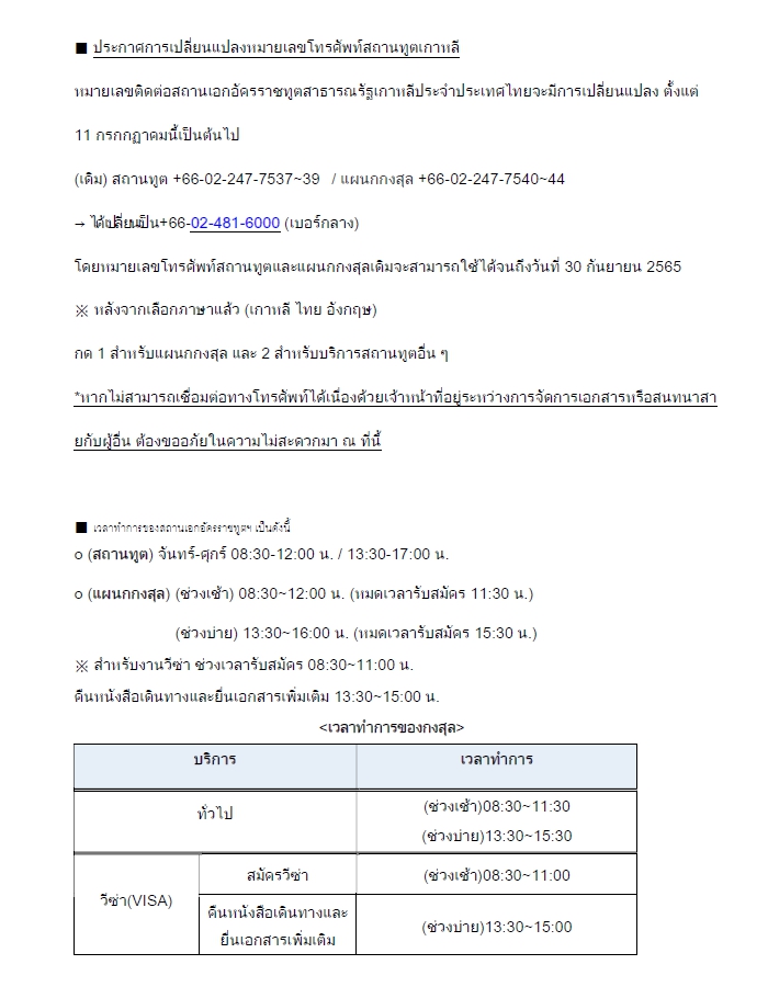 ประกาศการเปลี่ยนแปลงหมายเลขโทรศัพท์สถานทูตเกาหลี
