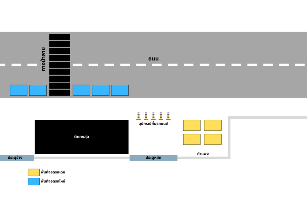 สามารถใช้พื้นที่จอดรถใหม่ได้ในช่วงเวลา 9.00 – 15.00 น. ของวันธรรมดา กรุณาใช้ข้อมูลนี้อ้างอิงเมื่อมาใช้บริการที่สถานเอกอัครราชทูต